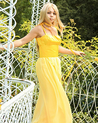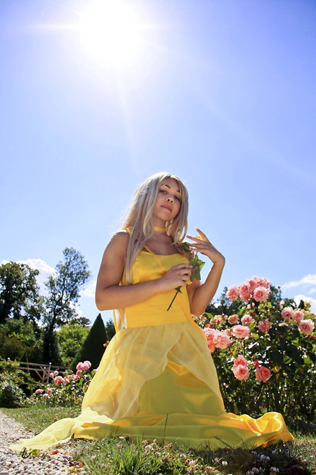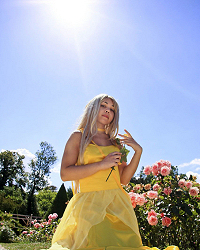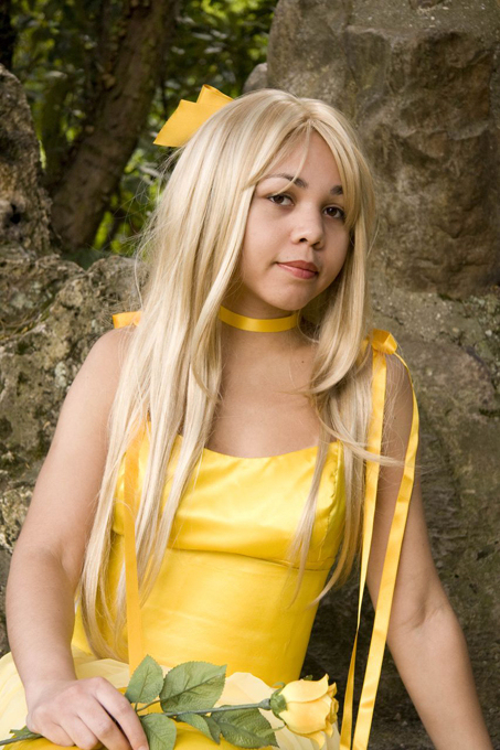 "This dress wasn't the ideal costume to walk around in a convention! The ribbon straps kept sliding off my shoulders, and the dress was so long that I couldn't walk properly without lifting it permanently. People also kept stepping on my veil, it was all disgusting at the end of the day =_= I'm still glad nobody actually ripped it by accident. Anyway, I'm glad I made it, I like the golden yellow color a lot! Sorry for spamming this page with so many pictures, but I liked the result of the photoshooting so much I had a hard time choosing the pics. =)" |